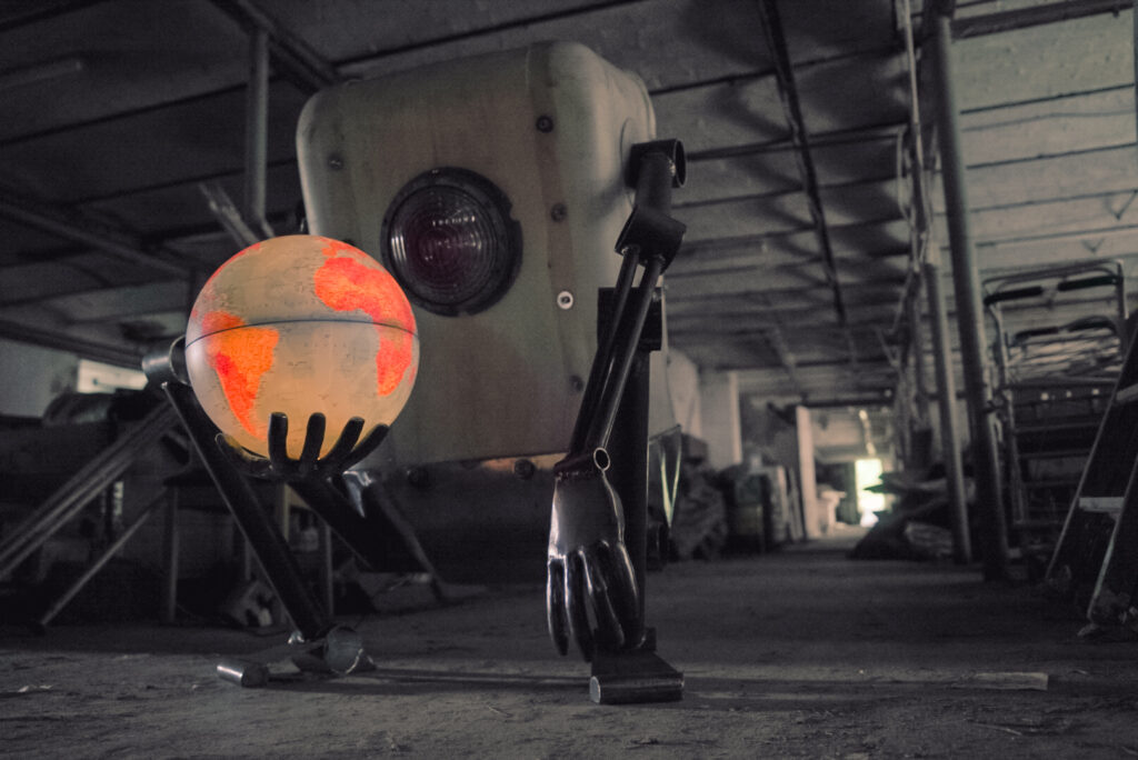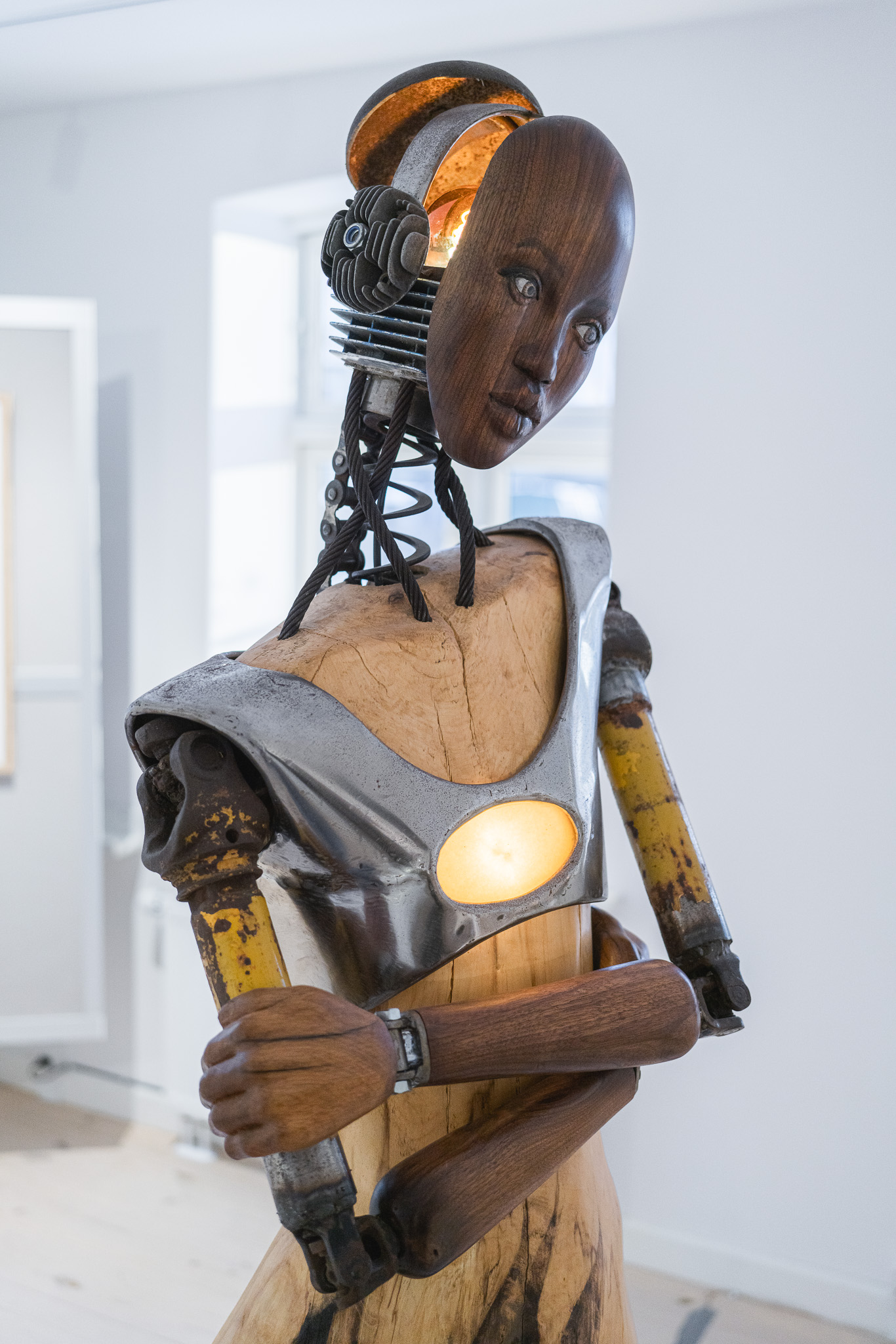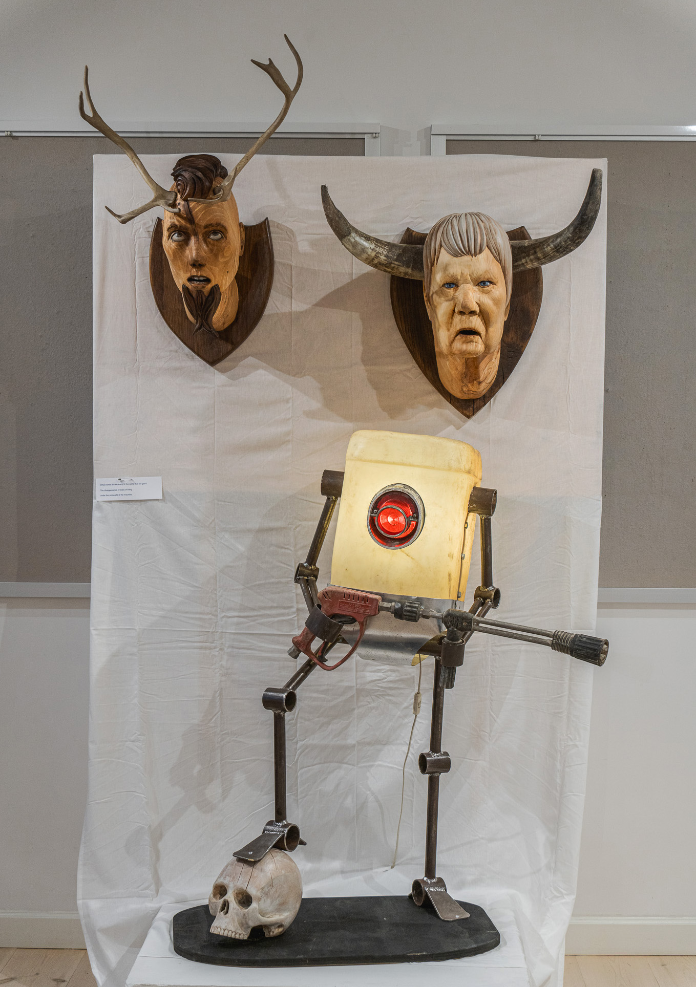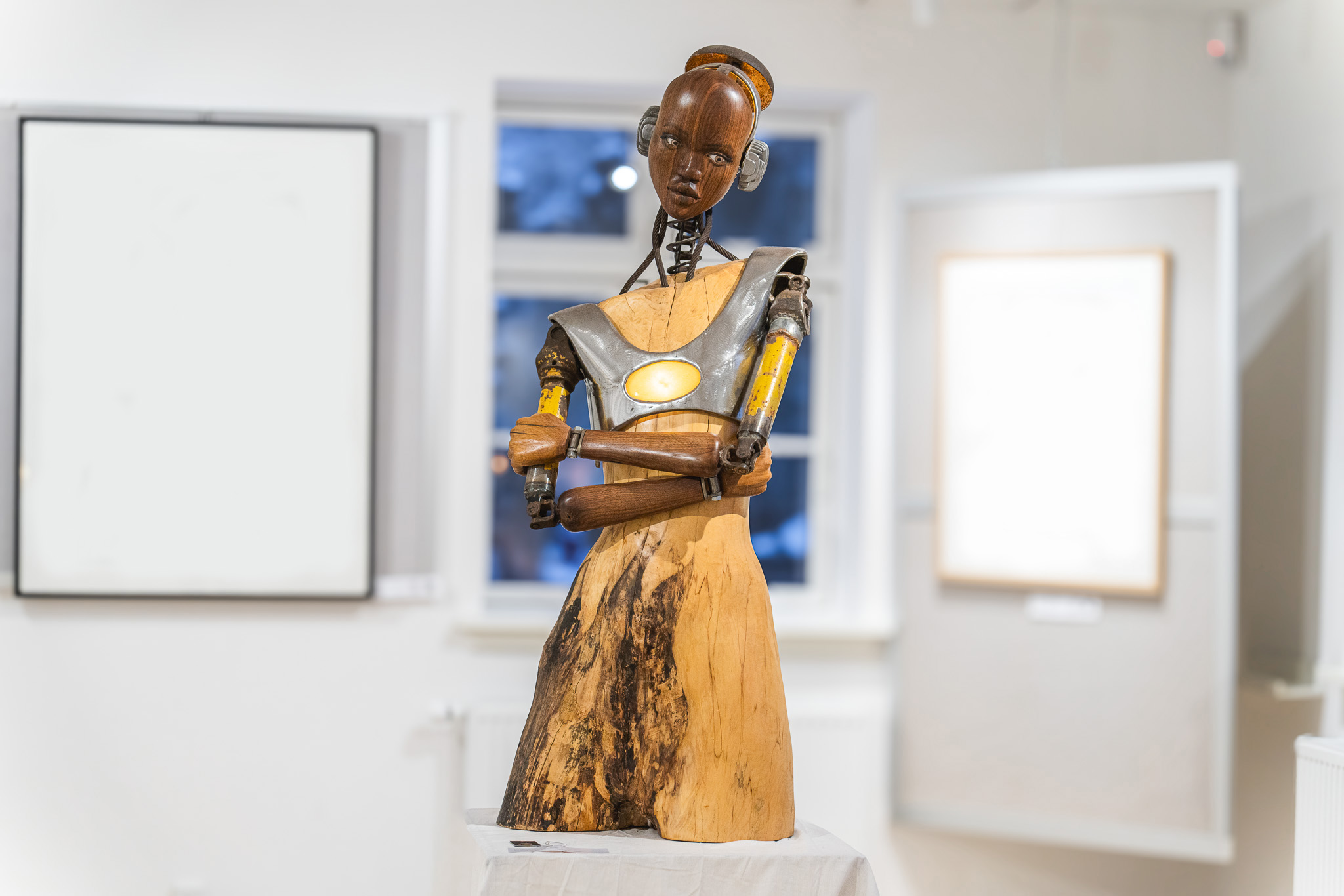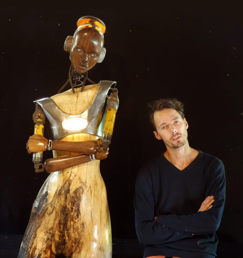 It felt right that through my metalworking skills, with the metal, found objects, plastic, etc. I would represent the technological, the synthetic, the artificial, the robotic, as one side of things. And on the other side, through my woodworking skills, with wood I would represent the organic, nature, life, human and other creatures.