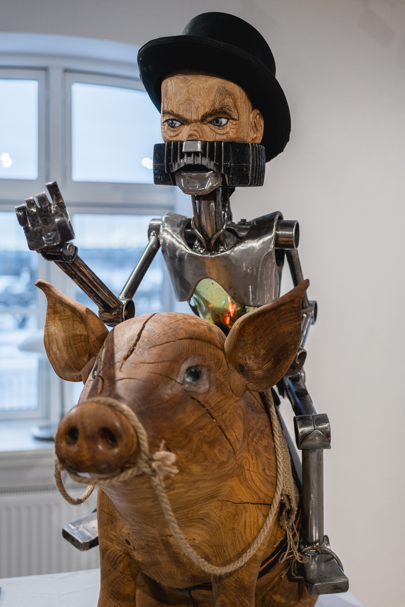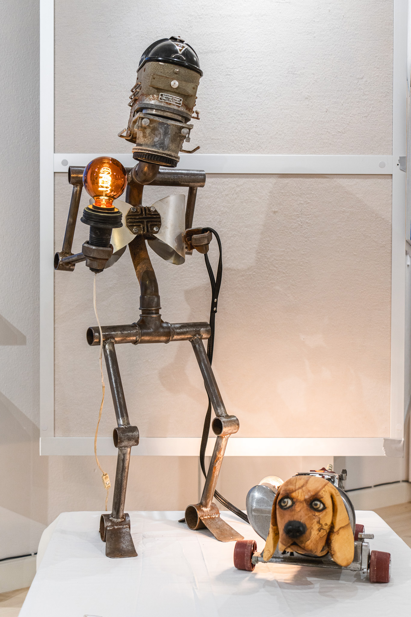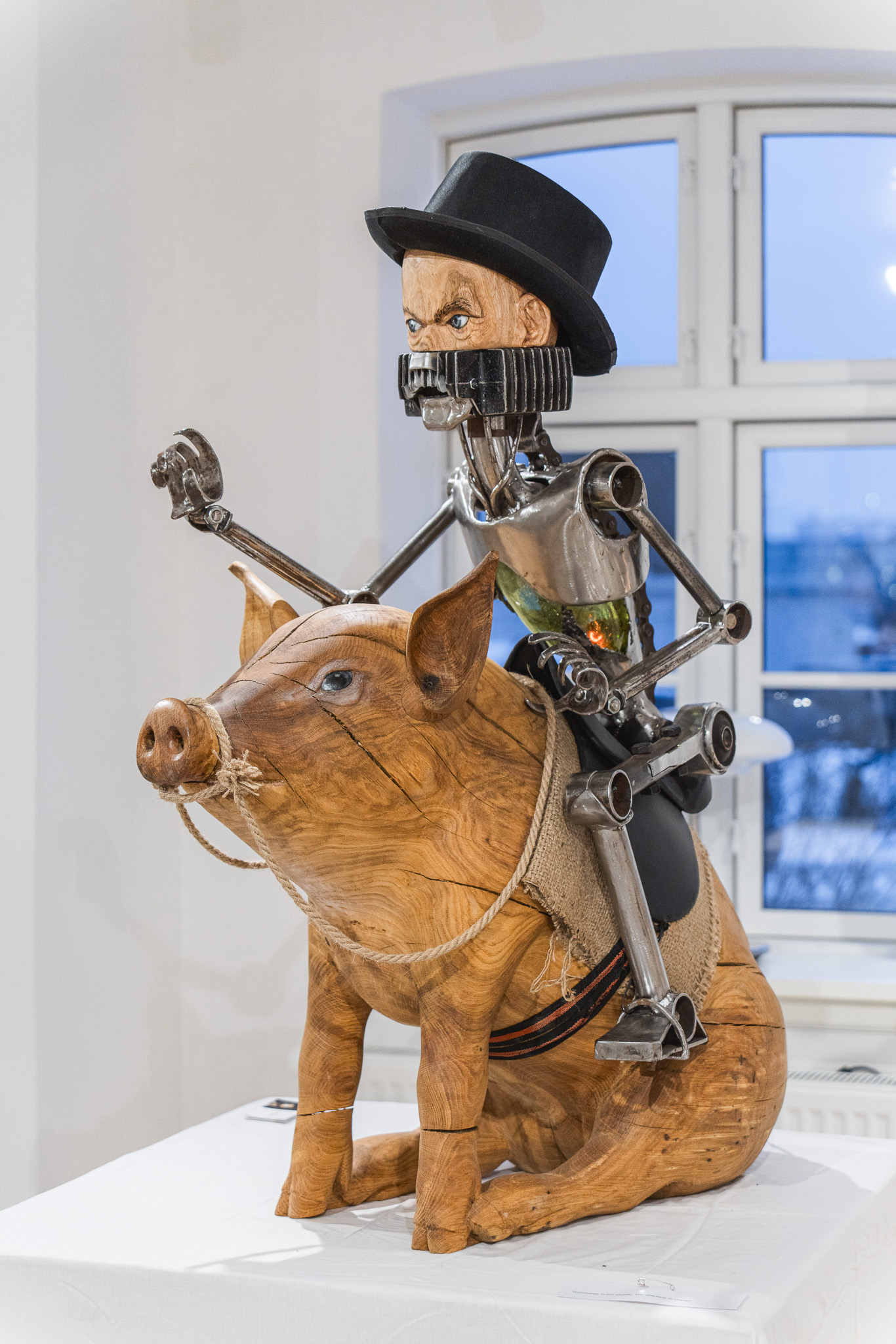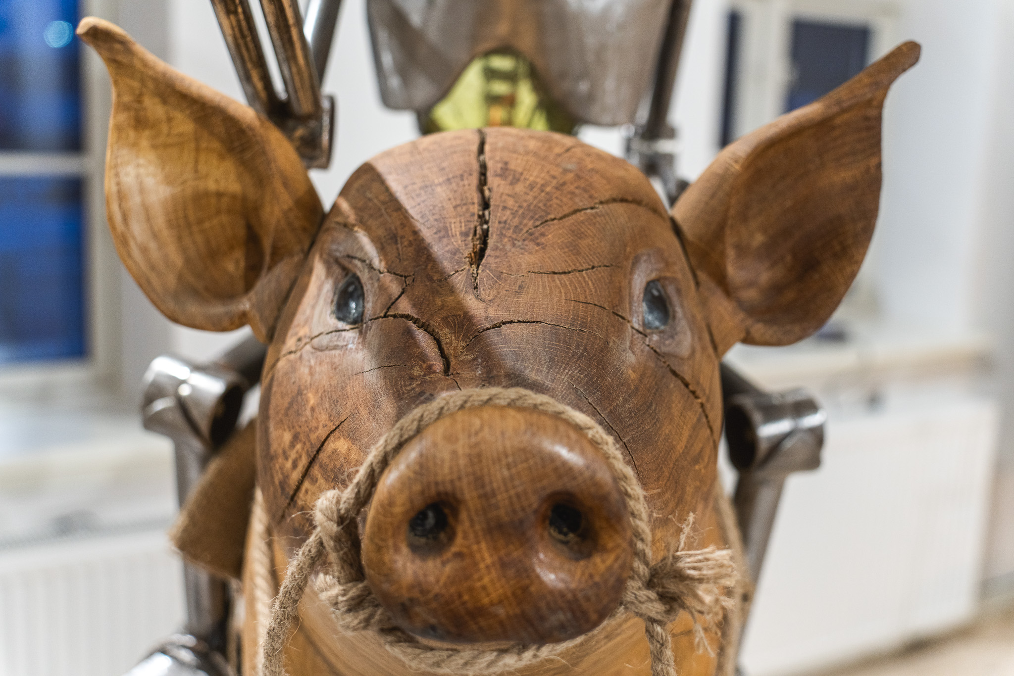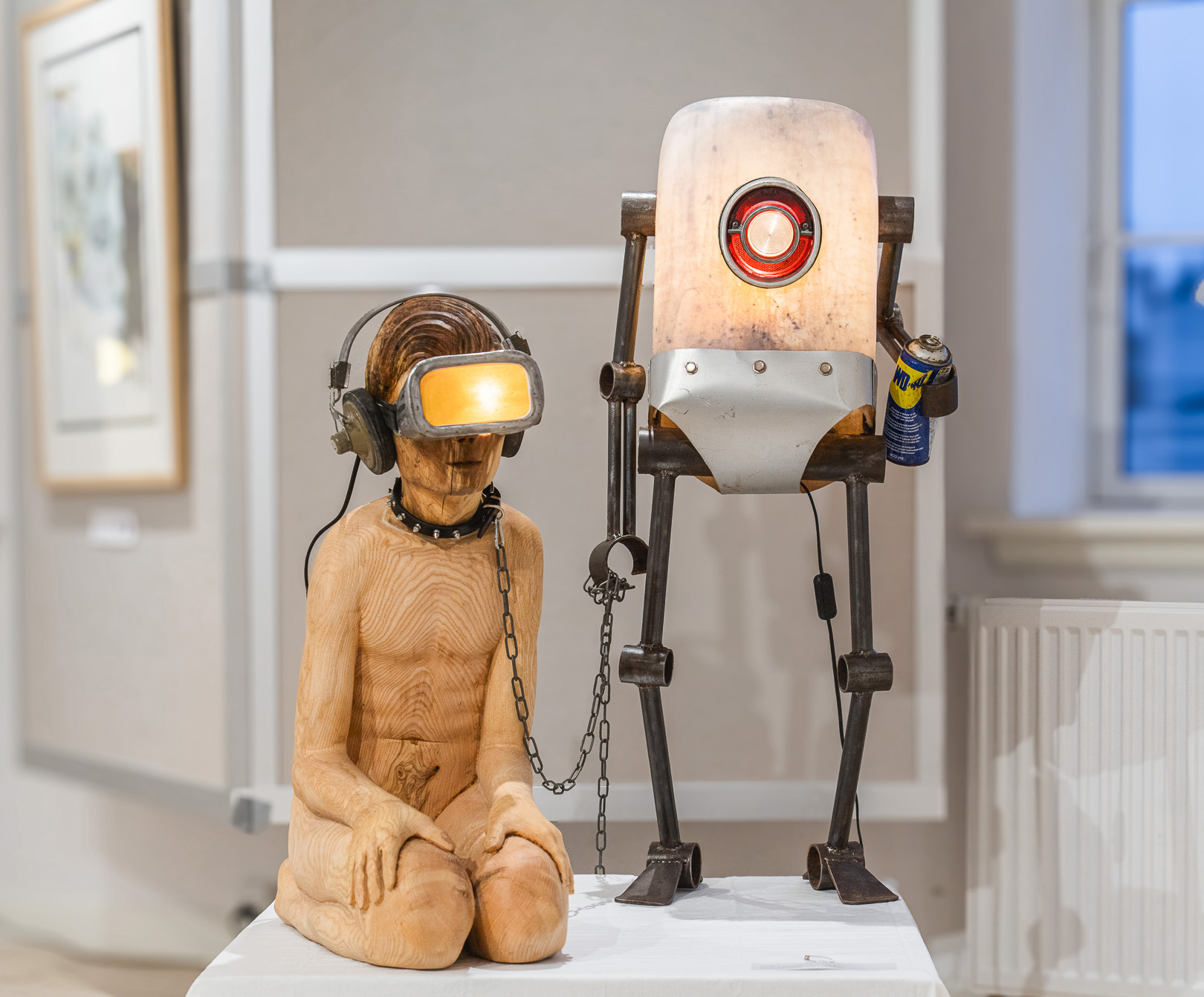 It felt right that through my metalworking skills, with the metal, found objects, plastic, etc. I would represent the technological, the synthetic, the artificial, the robotic, as one side of things. And on the other side, through my woodworking skills, with wood I would represent the organic, nature, life, human and other creatures.