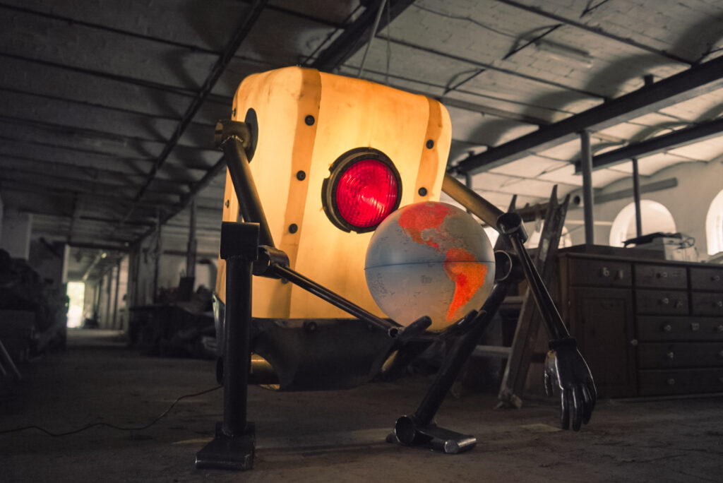 It started when an old IBC tank filled with piss fell off a flatbed truck, deforming it beyond use. I thought it looked interesting in its deformity so I put a lamp inside to turn it into a sculpture.